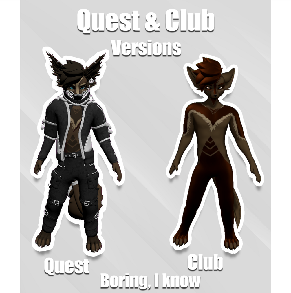 You will receive a ready to go VRChat avatar and all the fixins. Unity Packages for PC/Quest and maybe Club, Substance files and anything else that may be relevant.